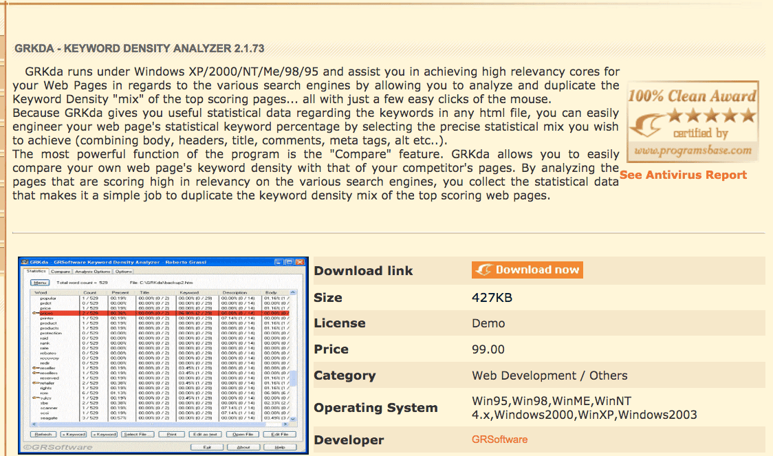 But it didn’t “work”. That is, keyword density in no way whatsoever correlated with ranking. I compared my results with all the other products available and not one of them gave actionable information. Shock and horror – they were all lying their asses off. And they still are!!! GRKda is – unbelievable – still for sale today.